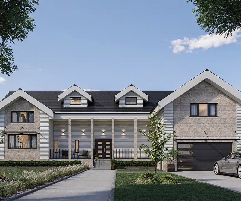 This acreage-style home has ample room, featuring 2 full-size bedrooms, 2 master bedrooms, and a mother-in-law suite. The vaulted ceilings on the upper level offer a luxurious feel while allowing natural light to flow freely thru the dormer windows. Intended for a wider lot, although alterations can be made to narrow the building envelope.Â
