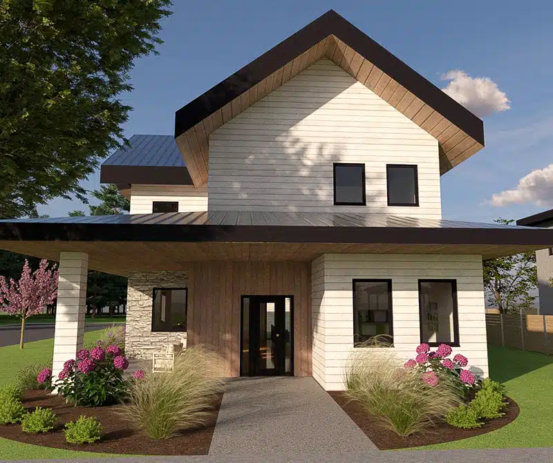 A simple roofline, architectural entry accent and modern windows result in an exciting update to the basic North End home. With over 2,000 square foot footprint, this cozy home lives large. An open floorplan includes a bright and open living room which flows onto the open island kitchen and dining area. Upstairs you will find two bedrooms that share a generous 4-piece bathroom, laundry room, and Primary bedroom that features a walk-in closet and expansive ensuite bathroom.